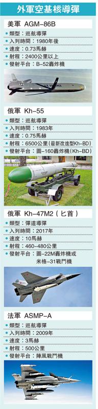 图:外国空气核导弹美国军事AGM-86B•类型:巡航导弹•进入时间:1980年以后:速度:0.73•范围:上限2400公里•平台•平台发射:B-52炸弹式俄罗斯KH-55•类型:巡航导弹•入口时间:1983年•速度:083•速度:0.75•范围:最新(最新)(最新(最新)(最新(最新)(最新(最新)(最新(最新(最新)(最新(最新)(最新(最新)(最新(最新(最新)(最新(最新(最新)(最新(最新)((最新(最新)) (KH-BD) Russian KH-47M2 (Dagger) • Type: Ballistic Missile • Entry time: 2017 • Speed: Mach 10 • Range: 460-480 kilometers • Launch Platform: TU-22M Bomber or Mig-31 Fighter French ASMP-A • Type: Cruise Missile • ENTERMINATION TIME: 2009 Faith